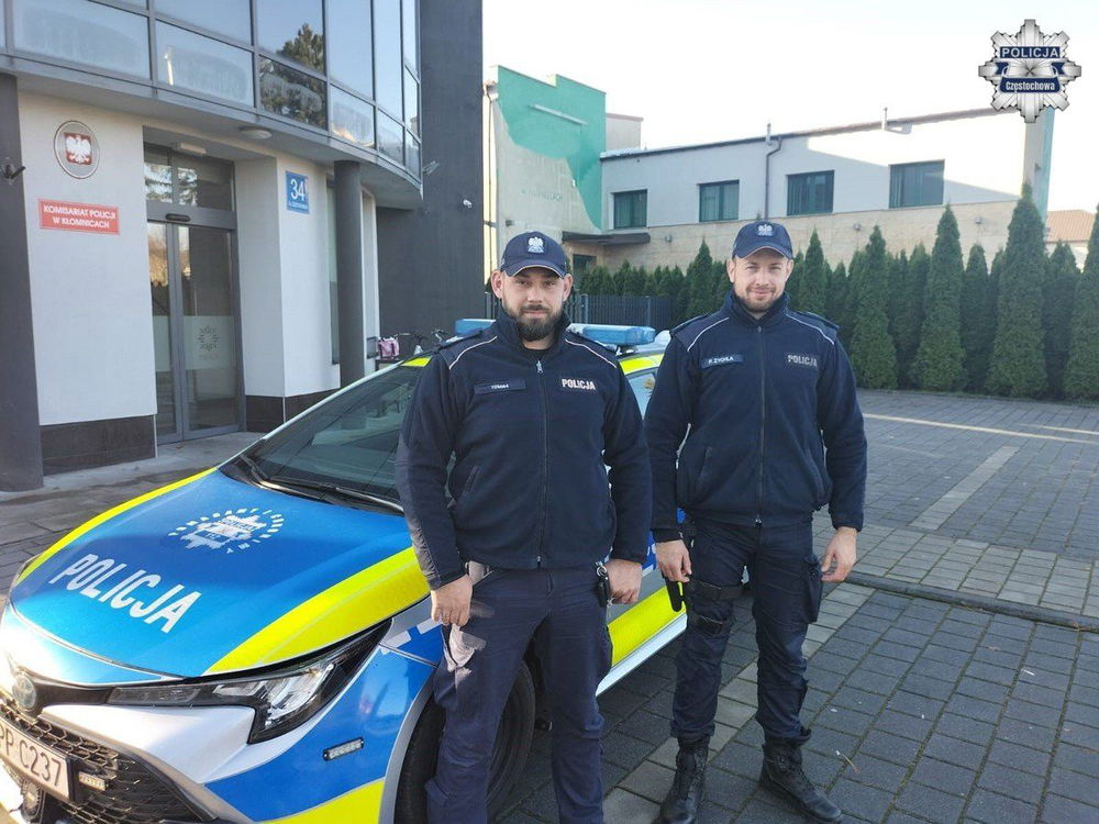 Dzielnicowi z Komisariatu Policji w Kłomnicach mł. asp. Przemysław Zychla i sierż. sztab. Jakub Chmielarz podczas obchodu rejonu na ulicy Częstochowskiej zostali zatrzymani przez roztrzęsionego mężczyznę, który poinformował, że jego syn zasłabł w samochodzie.