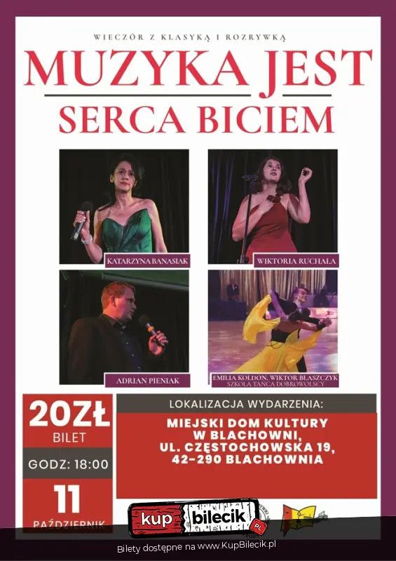 bilety: Jest to podróż i powrót do historii polskiej muzyki. Jest to możliwość zagłębienia się i poznania dalekiej jak i bardziej współczesnej przestrzeni muzycznej. To przywołanie brzmienia niestety niezapomnianych pełnych nostalgii utworów. Melodii, które wyzwolą u Państwa mnóstwo emocji i wiele wspaniałych wrażeń artystycznych. To okazja do delektowania się cudownymi brzmieniami utworów muzyki klasycznej oraz rozrywkowej. W trakcie bowiem naszych muzycznych spotkań usłyszycie Państwo utwory muzyki klasycznej Franza Schuberta, Wolfganga Amadeusza Mozarta, piosenki aktorskiej z rep. Ewy Demarczyk, Edyty Geppert oraz kabaretowej z rep. Kabaretu Starszych Panów. Nie zabraknie również podczas naszych koncertów coverów światowych hitów muzyki popowej z rep. Celine Dion, czy też klasycznych ballad rockowych z rep. Elvisa Presleya. Muzyka jest Serca biciem artyści: Katarzyna Banasiak, Adrian Pieniak, Wiktoria RuchałaJest to podróż i powrót do historii polskiej muzyki. Jest to możliwość zagłębienia się i poznania dalekiej jak i bardziej współczesnej przestrzeni muzycznej. To przywołanie brzmienia niestety niezapomnianych pełnych nostalgii utworów. Melodii, które wyzwolą u Państwa mnóstwo emocji i wiele wspaniałych wrażeń artystycznych. To okazja do delektowania się cudownymi brzmieniami utworów muzyki klasycznej oraz rozrywkowej. W trakcie bowiem naszych muzycznych spotkań usłyszycie Państwo utwory muzyki klasycznej Franza Schuberta, Wolfganga Amadeusza Mozarta, piosenki aktorskiej z rep. Ewy Demarczyk, Edyty Geppert oraz kabaretowej z rep. Kabaretu Starszych Panów. Nie zabraknie również podczas naszych koncertów coverów światowych hitów muzyki popowej z rep. Celine Dion, czy też klasycznych ballad rockowych z rep. Elvisa Presleya. Bilety do nabycia na: KupBilecik.pl |