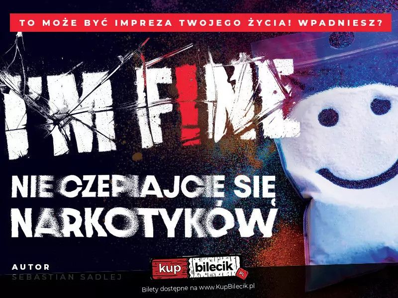 bilety: I"m f!ne "Nie Czepiajcie Się Narkotyków". Spektakl profilaktyczny dla młodzieży. To nie teatr, który moralizuje i poucza. To teatr, który wali prosto między oczy. Nawet jeśli myślisz, że ciebie to nie dotyczy. Bo przecież ty już wiesz, co jest dobre, a co złe… Wiesz to, prawda? Rekomendowane jest dla dzieci od 12 roku życia. Autor - Sebastian Sadlej Obsada: I"m f!ne. "Nie Czepiajcie Się Narkotyków" artyści: Małgorzata Modrzycka, Ania Wilk, Szymon Kowalik, Teresa Szajer, Bartłomiej Mazur i inniTroje przyjaciół spotyka się na imprezie. Chcą się po prostu dobrze bawić, przypomnieć sobie czasy, kiedy wszystko było prostsze. Ale świat już dawno przestał być piaskownicą, w której można bezpiecznie budować zamki. Każde z nich dźwiga swój własny ciężar - presję, lęki, tajemnice. Czy jeszcze mogą się uratować To nie teatr, który moralizuje i poucza. To teatr, który wali prosto między oczy. Nawet jeśli myślisz, że ciebie to nie dotyczy. Bo przecież ty już wiesz, co jest dobre, a co złe… Wiesz to, prawda Bilety do nabycia na: KupBilecik.pl |